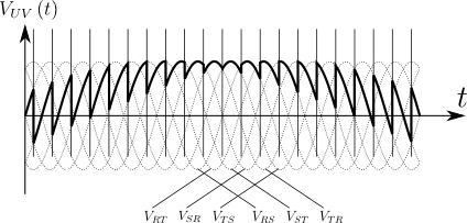 言い換えると,導通するサイリスタを切り替えていくことで,電圧\(V_{UV}\left({t}\right)\)は6つの線間電圧(式(1a)~式(1f))の間を乗り換えていくことができる.具体的に,一定時間ごとに\(V_{UV}\left({t}\right)\)が\(V_{RS}{\rightarrow}V_{RT}{\rightarrow}V_{ST}{\rightarrow}V_{SR}{\rightarrow}V_{TR}{\rightarrow}V_{TS}{\rightarrow}V_{RS}{\rightarrow}{\cdot}{\cdot}{\cdot}\)と6つの線間電圧の間を周期的に乗り換えていく場合の\(V_{UV}\left({t}\right)\)の例を図2に示そう.