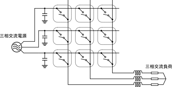このように,単相出力のサイクロコンバータは等価的にはスイッチ3つで表される.ということは,三相出力のサイクロコンバータは9個(\(3{\times}3=9\))のスイッチで表現できるのではないか?図4をご覧いただきたい.